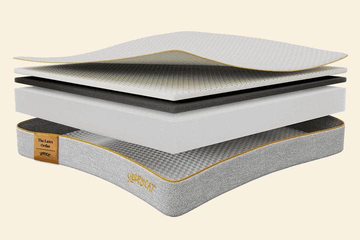 A firm orthopedic mattress with responsive latex and breathable foam layers. It is built to support your spine without trapping heat or losing shape over time.