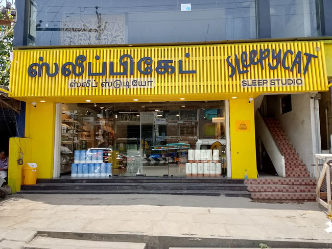 The SleepyCat store in Kamarajapuram is at New No. 155, Old No. 126, Velachery Road, Kamarajapuram, Sembakkam, Chennai, Tamil Nadu - 600073. You can drop by any day between 11:00 AM and 9:00 PM to check out our mattresses.